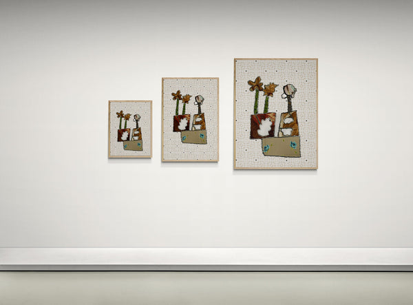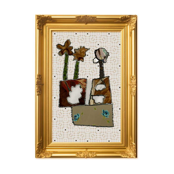 Sunlit blooms and rich desert texture. Desert Floralscape began as an original textile artwork by artist Sara Palacios, created with recycled fabric pieces and expressive layers of acrylic paint. Its warm palette and organic shapes bring modern desert beauty and depth to any space.