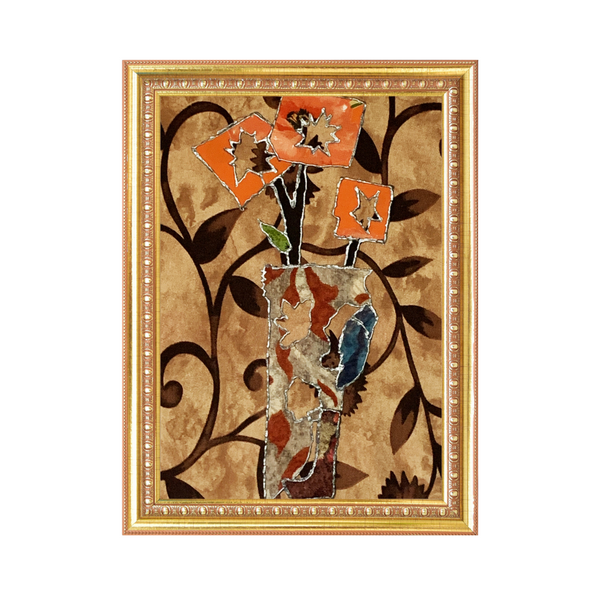 Warm tones, rich texture, cozy mood. Autumn Bloom originated as a textile artwork created from recycled fabrics, layered with acrylic paint—a modern floral design that feels tactile and alive.