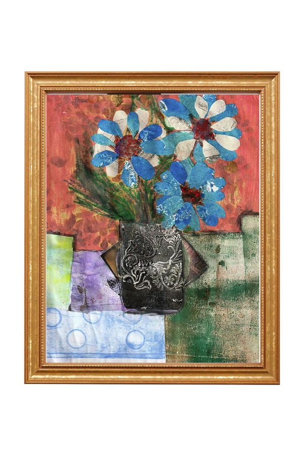 Quiet winter light and delicate petals. Flower Cold Moon began as an original mixed-media collage by artist Sara Palacios, created with hand-painted papers and monoprinted tissue papers. Its soft textures and cool, luminous tones bring calm elegance to any space.